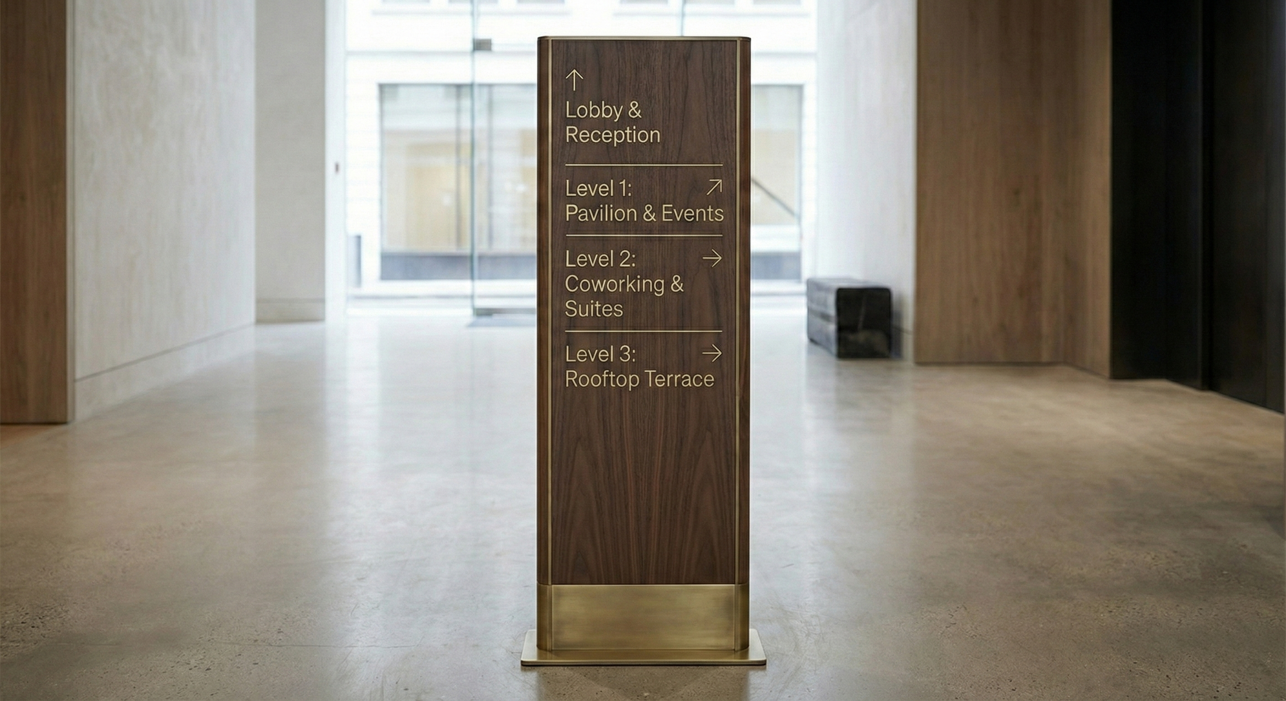 Brand expression is quiet and architectural. Typography is precise and disciplined, while graphic elements are minimal and integrated. Signage and digital displays function as part of the environment, providing clarity and orientation without visual dominance. Across all applications, consistency and proportion replace decoration, creating a system that feels settled and permanent.