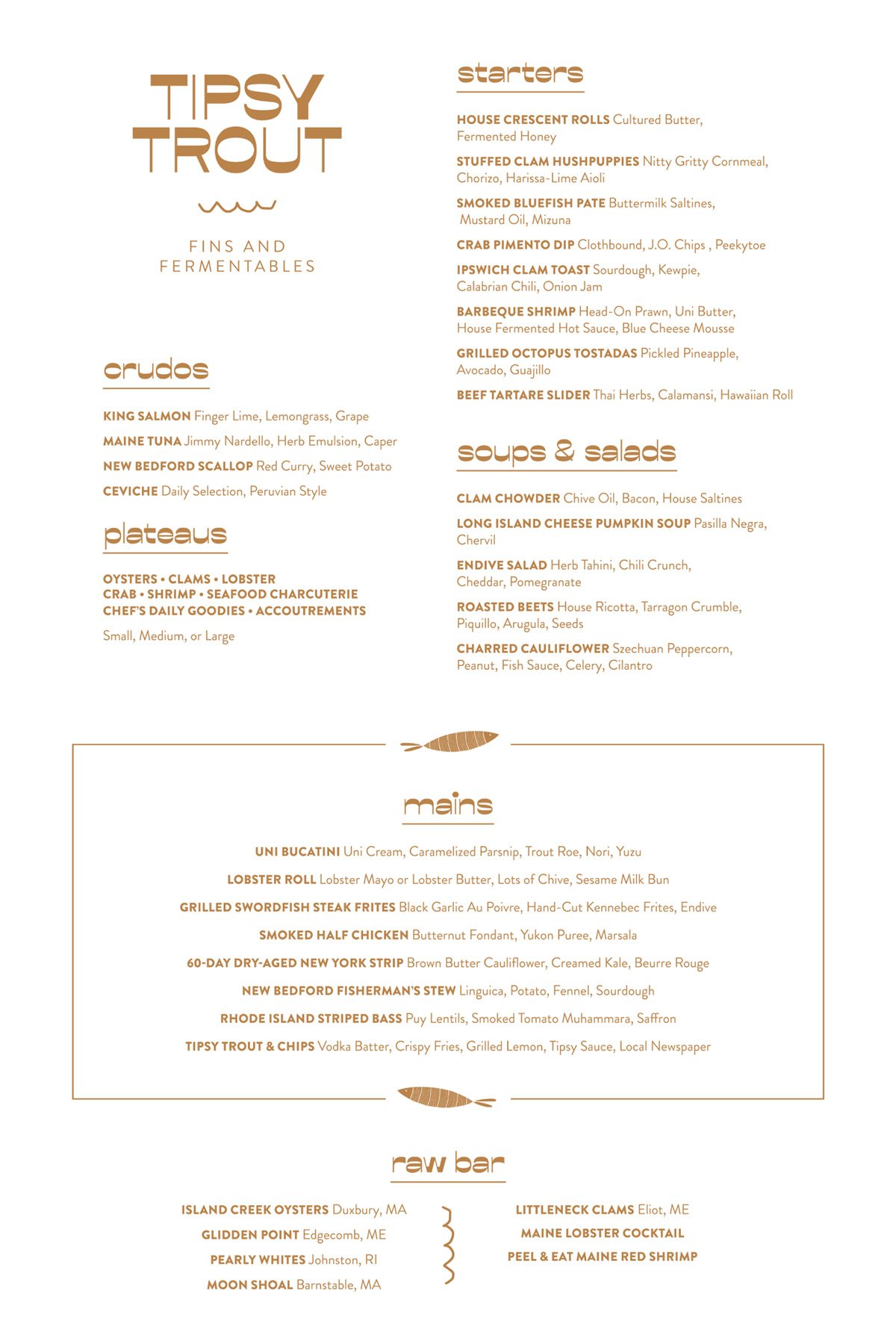 At Tipsy Trout we combine the region’s premium seafood with an unmistakably Vermont culinary approach. Our energetic, cocktail-forward and seafood-rich experience features Vermont’s best raw bar, shareable apps, coastal-inspired entrees, and a distinctive wine program.
