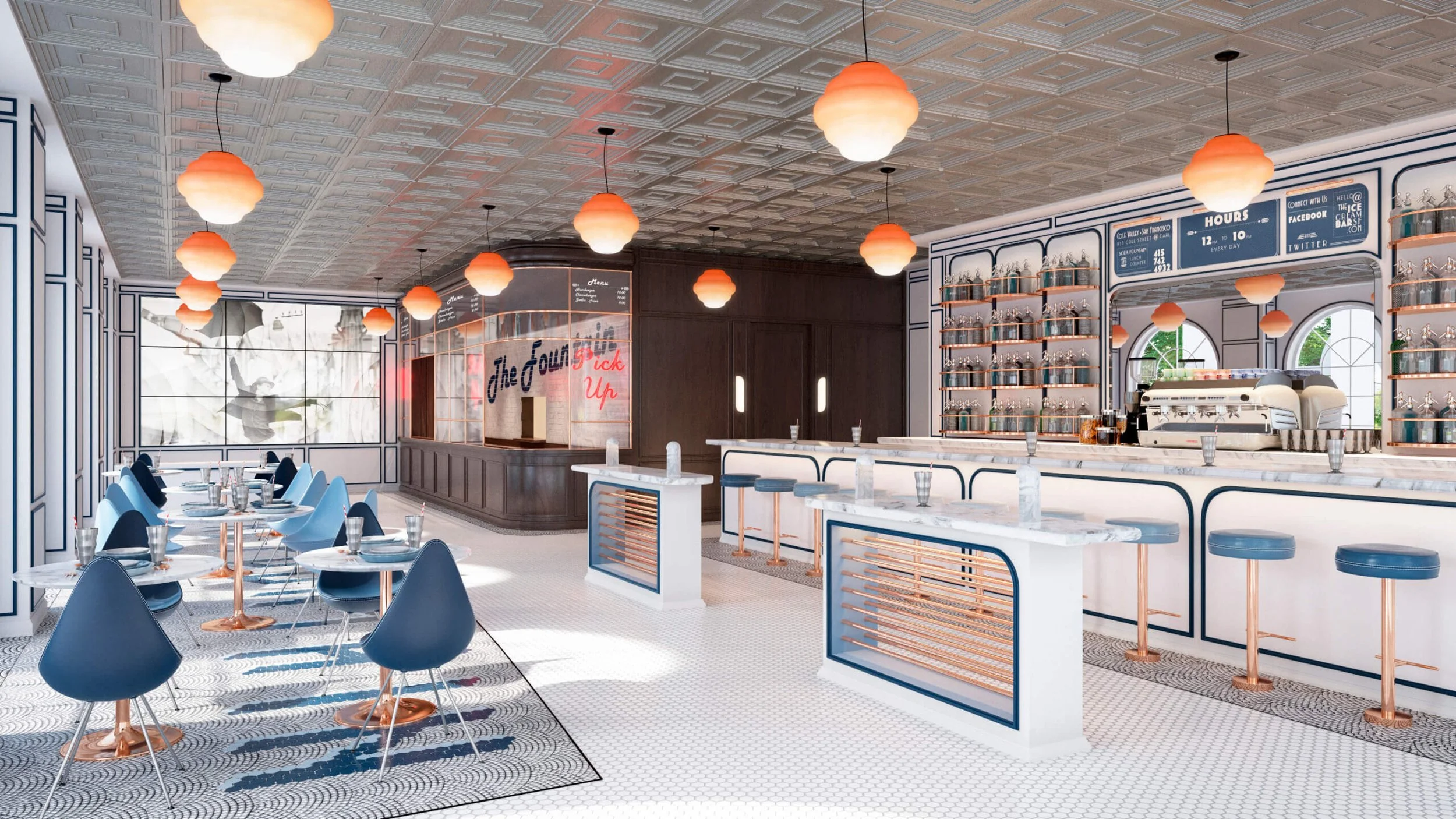 Inspired by 1960’S La Dolce Vita with a modern twist. The Espresso Bar reflects the indulgent goods it sells. A visual treat harking back to a more carefree time. Simple furniture with clean lines is juxtaposed against bold patterning and a bright feature bar to create a lighthearted space for guests to nibble and imbibe or night.