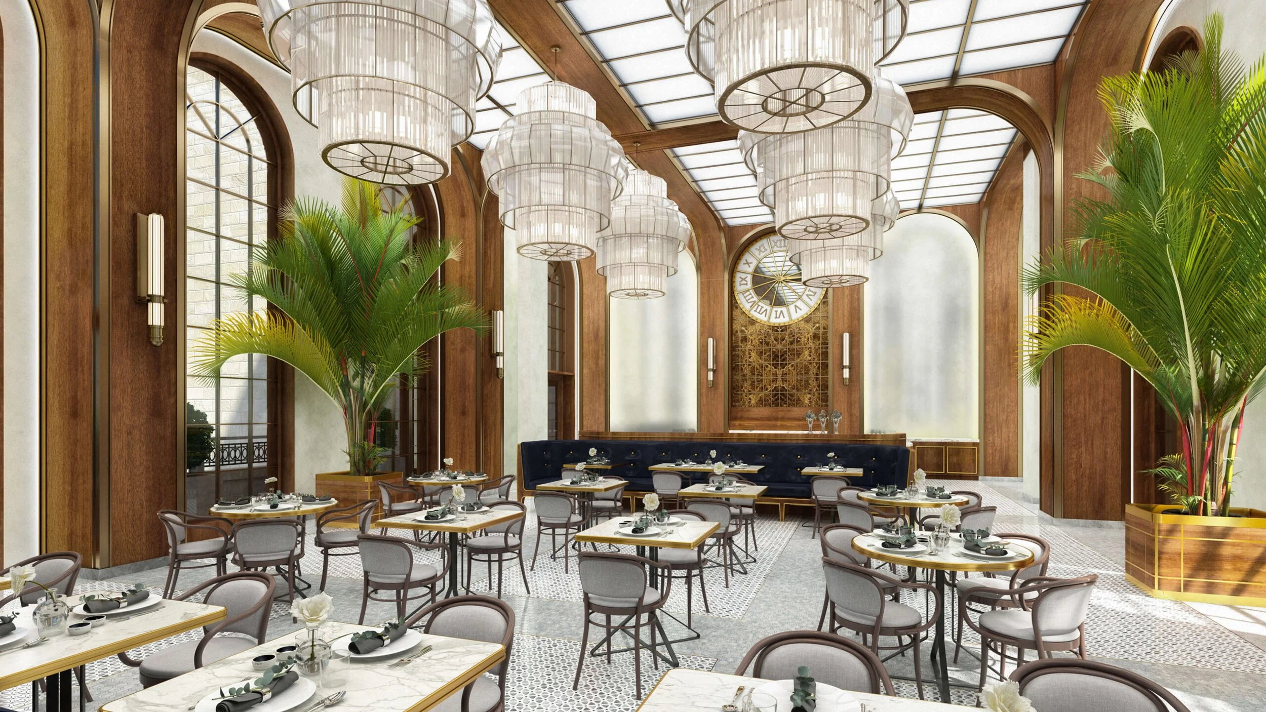 Inspired by a more glamorous era of travel, The Brasserie is light and airy, while deeply saturated blues, walnut tones and brass accents assist in seamlessly transforming the restaurant from day to night. Attention to every detail and a modern expression of construction create and an environment that unveils itself a bit more every time it is visited.